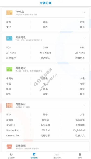 4、全新FM电台功能,实时流畅收听最新英语节目,锻炼英语听力必备;