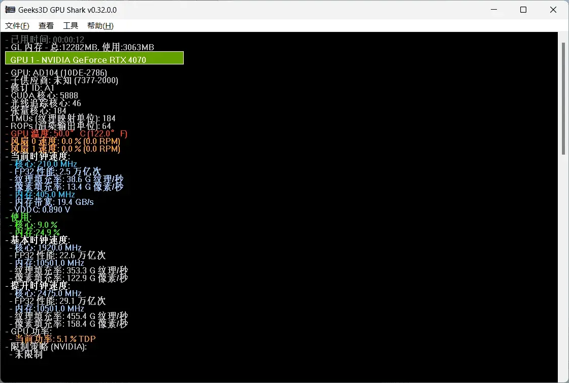 简单模式(默认),只显示必要的硬件信息:显卡名称、温度(GPU、PCB)和时钟(GPU、内存和着色器)。